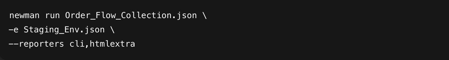 Staging_Env.json: This points Newman to your environment variables (like URLs and tokens). This is what makes the same command work for Dev, Staging, or Prod just by swapping the file.