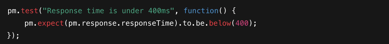 In addition to the status code, you might want to verify that the response time is within an acceptable threshold, say 400ms, to ensure the API’s responsiveness: