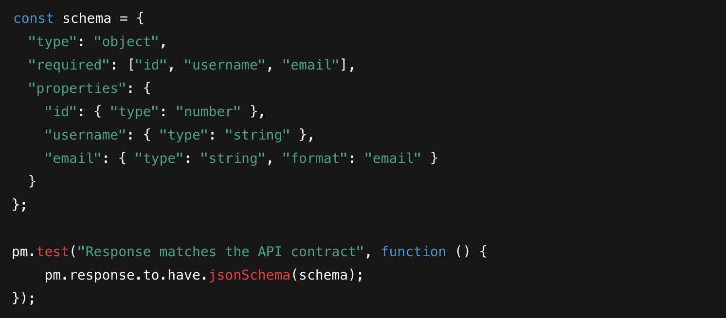 For instance, suppose you have a predefined JSON schema for a User object. You can use the following script to validate the response: