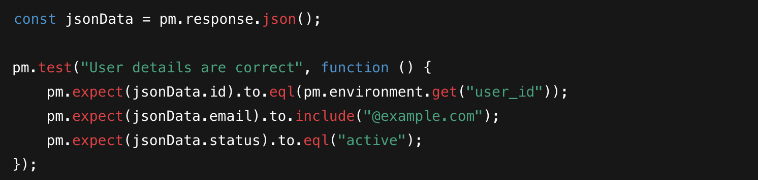 This is where we dig into the JSON. We don't just check if the data is there; we make sure it’s the right data. Using pm.expect(), we validate that the fields exist, the types are correct (string vs. number), and the values match our business logic.